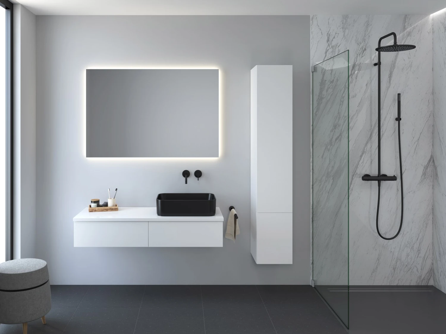 - Front: MDF-Kern mit Melaminharzdirektbeschichtung, Vorderseite zusätzlich mit einem einschichtigen Hochglanz UV-Acryllack beschichtet, Kanten umlaufend mit einer glänzenden Kunststoffdickkante belegt