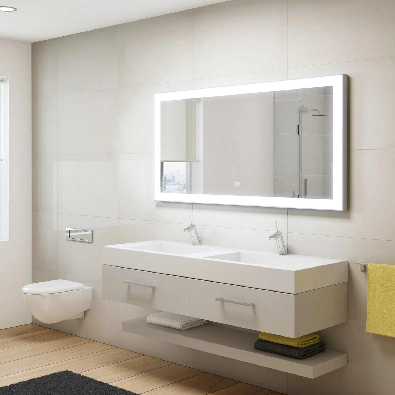 - mit in die Spiegelfläche integrierten Touch-Schaltern für an/aus, Dimmfunktion und Antibeschlag