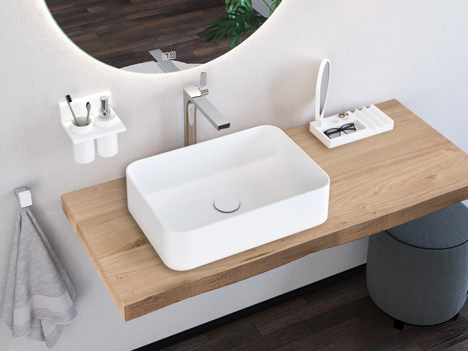 - Material: Messing verchromt in Kombination mit Mineralwerkstoff