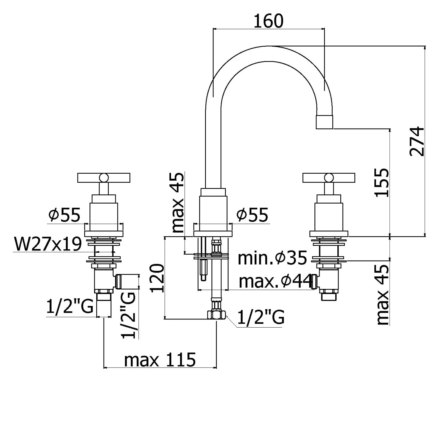 Kronenbach Zeta 2.0 Dreiloch-Waschtischmischer ohne Ablaufgarnitur
